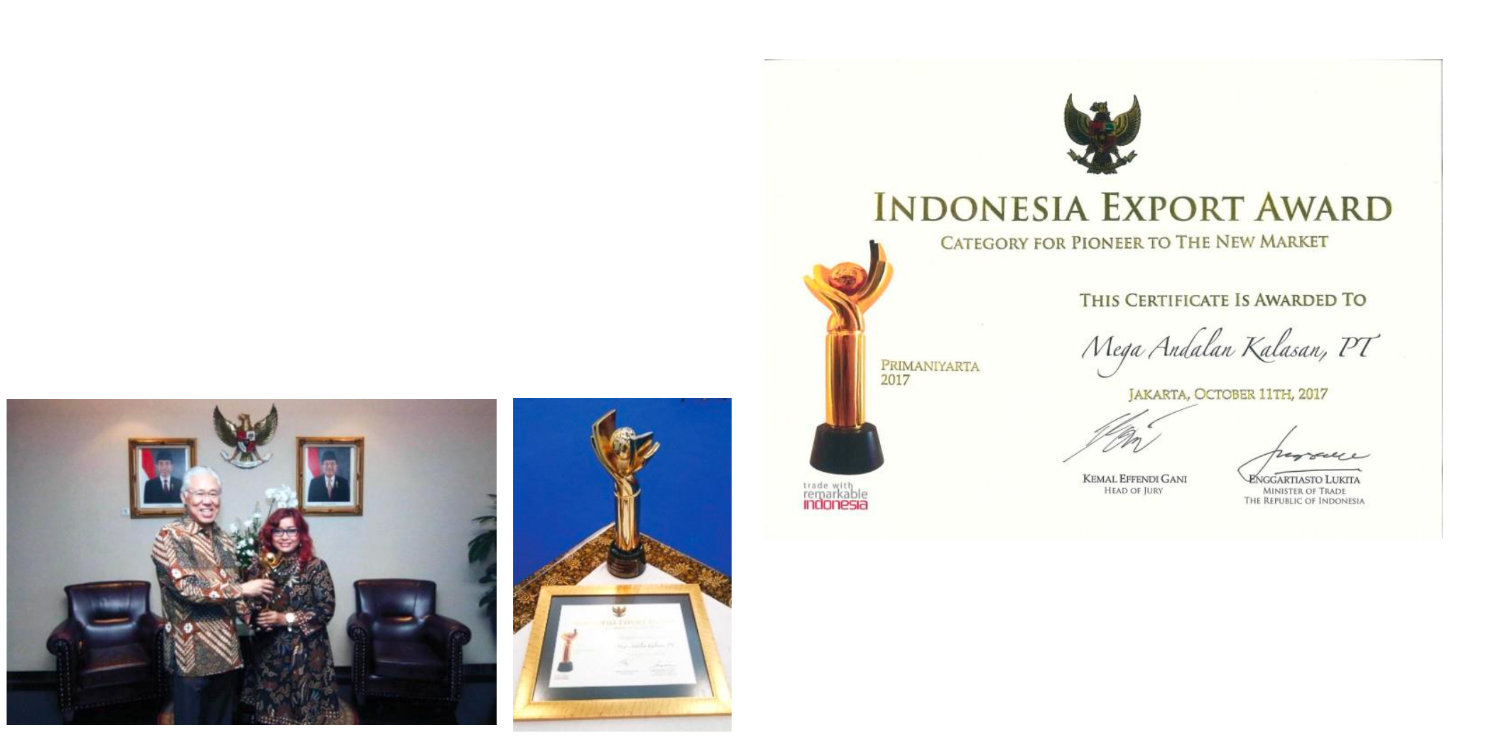PT Mega Andalan Kalasan proudly won the highest Primaniyarta award in the Pioneer Market Exporter Category in 2016, 2017, and 2019. This remarkable achievement underscores the company’s commitment to excellence and innovation in expanding into new markets, solidifying its reputation as an exemplary exporter.